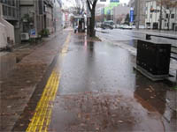 横断歩道橋や歩道のヒーティングについては、まだ電源が入っておりません。地中熱式融雪の区間は通年、地表熱を地中に回すポンプが動いているため、幾分余熱の影響で融けているようですが、電熱式の区間は全く融けていません。