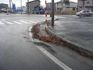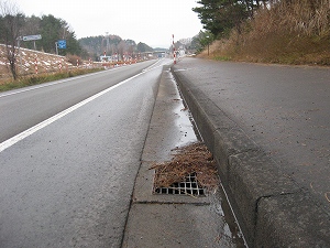 号環状道路で落ち葉などがたまって路面排水桝